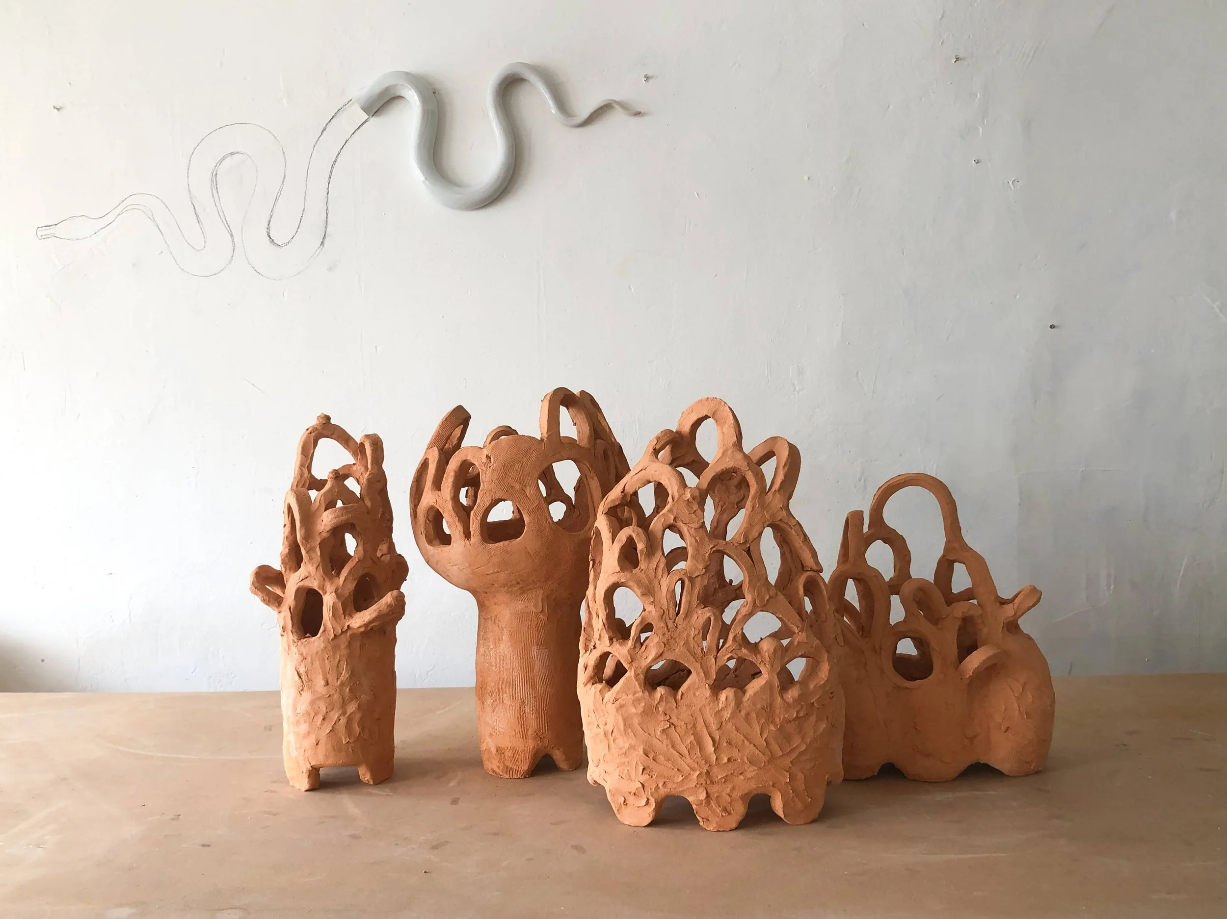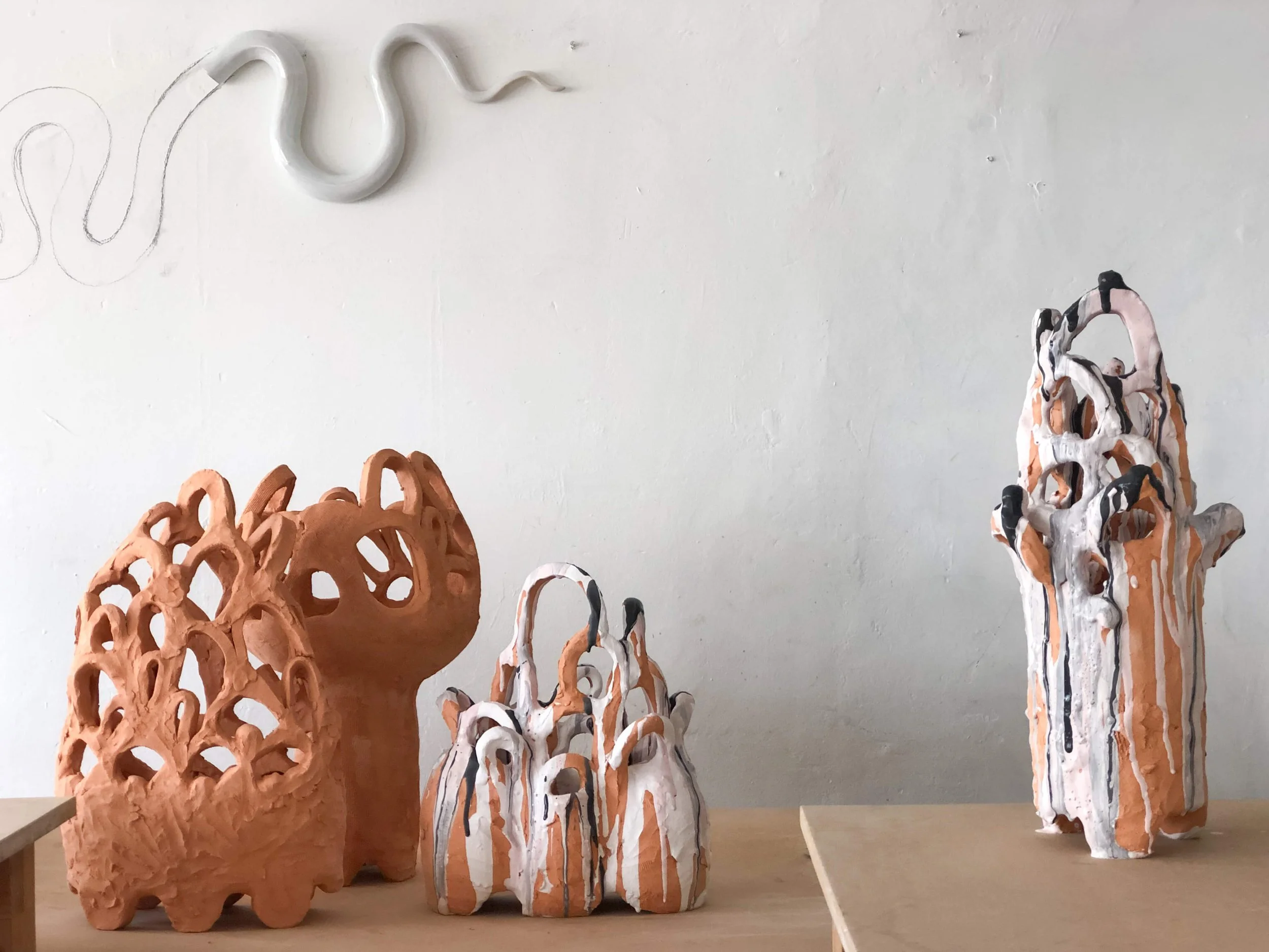 Using off cuts from a tile project to build random free form pieces with no plan no agenda, no tools, no rules.